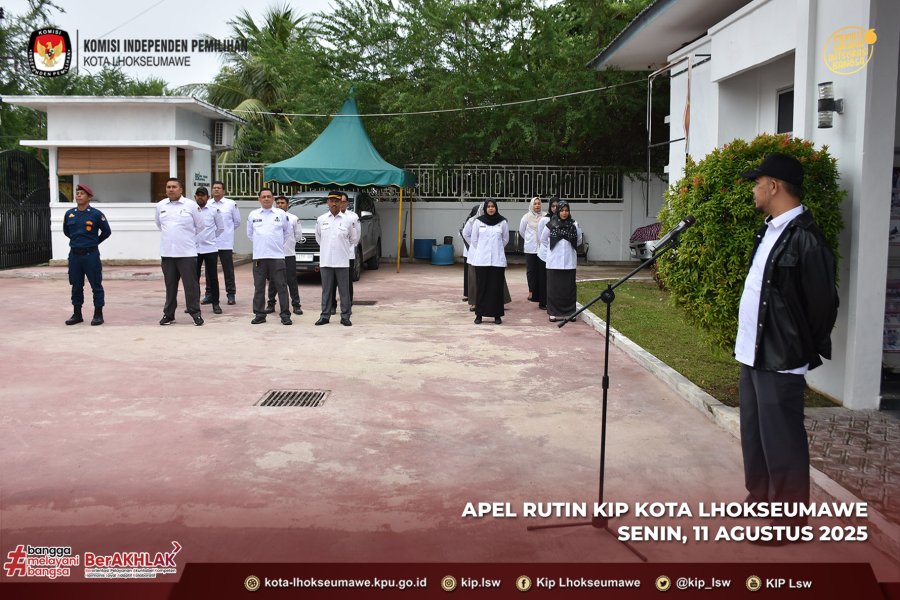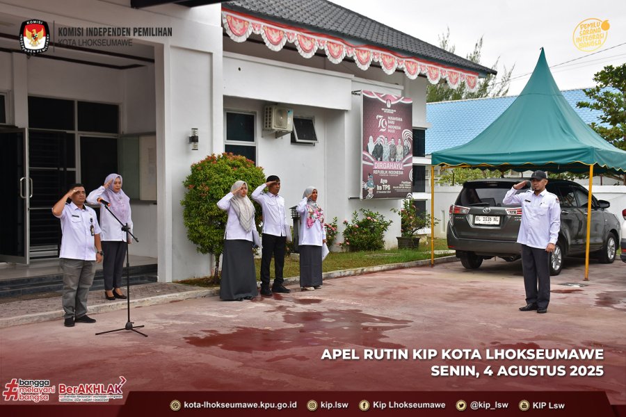 Komisi Independen Pemilihan (KIP) Kota Lhokseumawe menggelar apel pagi, di halaman Kantor setempat, Senin (4/8/2025). Bertindak sebagai pembina apel pada pagi ini Kasubbag Teknis Penyelenggaraan Pemilu dan Hukum, Isran. Apel diikuti oleh jajaran Kasubbag dan Staf Sekretariat. Apel diawali dengan menyanyikan lagu Indonesia, pembacaan naskah pancasila, UUD 1945, prasetya Korp pegawai, amanat pembina dan di akhiri dengan doa.
