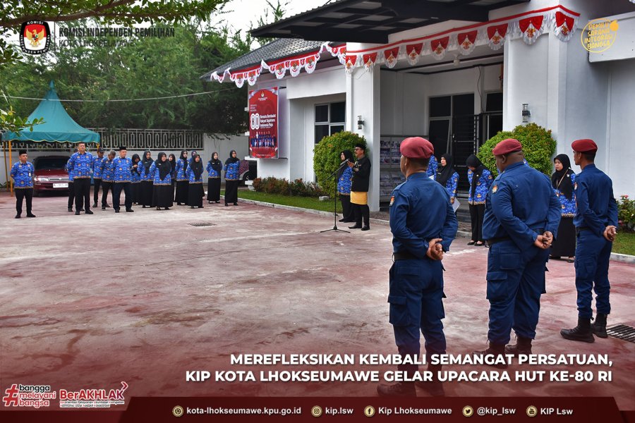 Memperingati HUT ke-80 Republik Indonesia, KIP Kota Lhokseumawe menggelar upacara di halaman kantor KIP Kota Lhokseumawe, Minggu pagi (17/8). Mengangkat tema Bersatu Berdaulat, Rakyat Sejahtera, Indonesia Maju. T. Marbawi, Anggota KIP Divisi Teknis Penyelenggara Pemilu bertindak sebagai pembina upacara dan Komandan Upacara, Kasubbag Teknis dan Hukum, Isran. Dalam amanatnya, ia mengajak dengan semangat kemerdekaan yang hakiki sebagai Aparatu Sipil Negara (ASN) teruslah bekerja sebaik-baiknya dalam rangka berbakti kepada bangsa dan negara. Upacara yang khidmat ini turut diikuti Sekretaris, Yuni Raziati serta Kasubbag dan Staf pada Sekretariat KIP Kota Lhokseumawe.