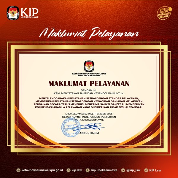 Maklumat Pelayanan KIP Kota Lhokseumawe. Dengan ini KIP Kota Lhokseumawe berjanji dan menyanggupi menyelenggarakan pelayanan sesuai dengan standar operasional prosedur serta melakukan perbaikan secara terus menerus.