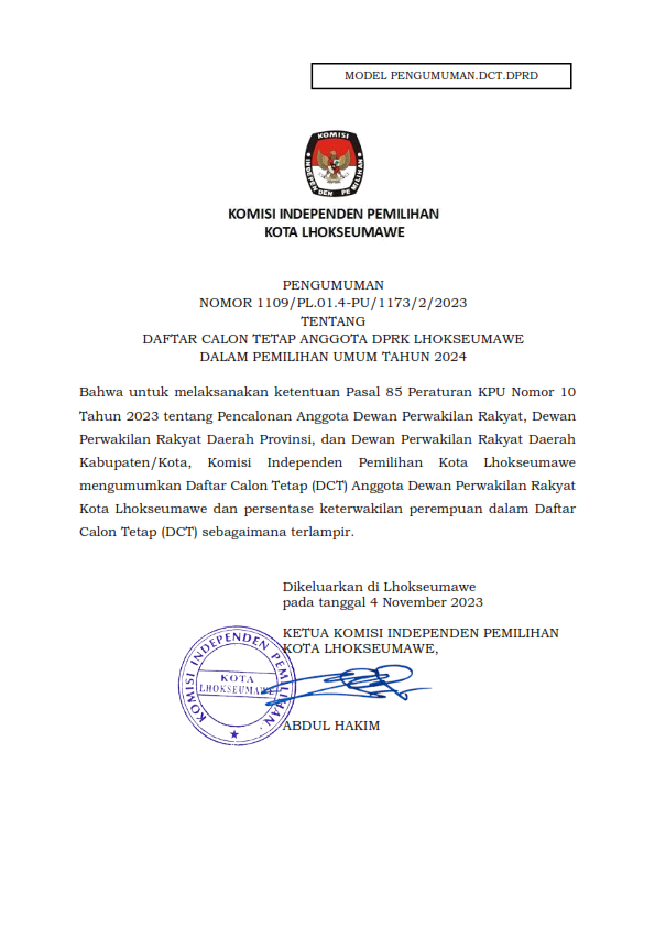 Berdasarkan Pengumuman Nomor : 1109/PL.01.4-PU/1173/2/2023 Tentang DAFTAR CALON TETAP ANGGOTA DPRK LHOKSEUMAWE DALAM PEMILIHAN UMUM TAHUN 2024, berikut Daftar Calon Tetap (DCT) Anggota DPRK Lhokseumawe dan Presentase Keterwakilan Perempuan dalam Daftar Calon Tetap (DCT) sebagaimana terlampir.