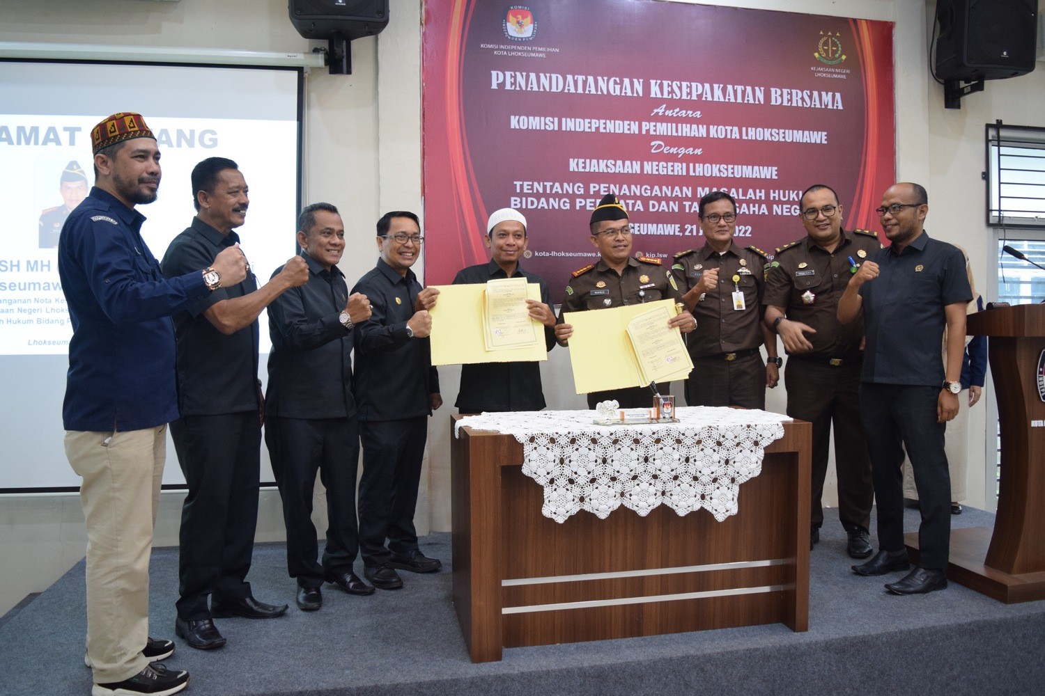 Komisi Independen Pemilihan (KIP) Kota Lhokseumawe melakukan nota kesepahaman atau Memorandum Of Understanding (MoU) dengan Kejaksaan Negeri (Kejari) Lhokseumawe tentang penanganan masalah hukum bidang perdata dan tata usaha negara, Selasa (21/6) di Kantor KIP setempat.