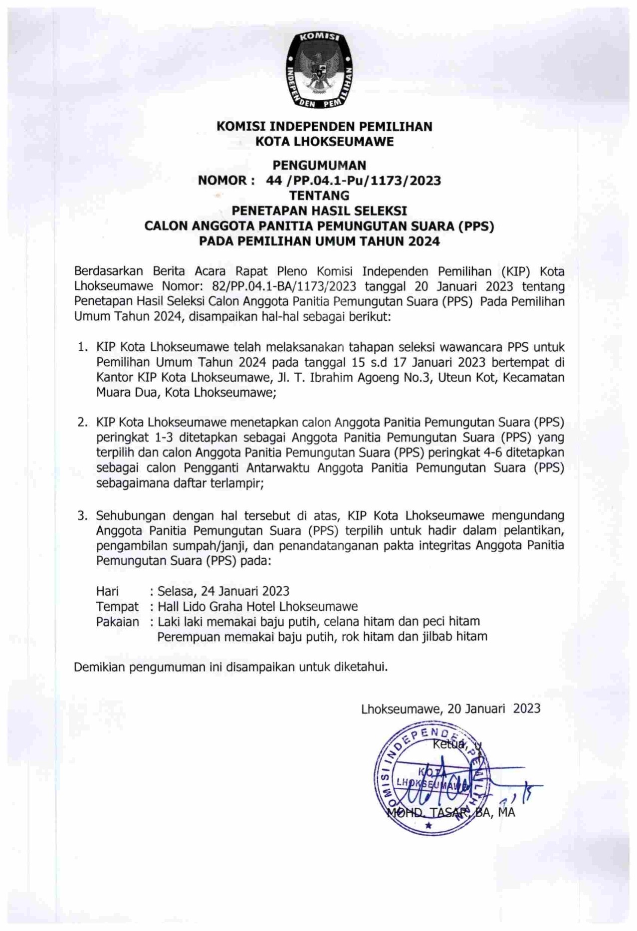 Penetapan Hasil Seleksi Calon Panitia Pemungutan Suara (PPS) Pada Pemilihan Umum Tahun 2024 Komisi Independen Kota Lhokseumawe dapat di unduh di tautan berikut ini Download disini