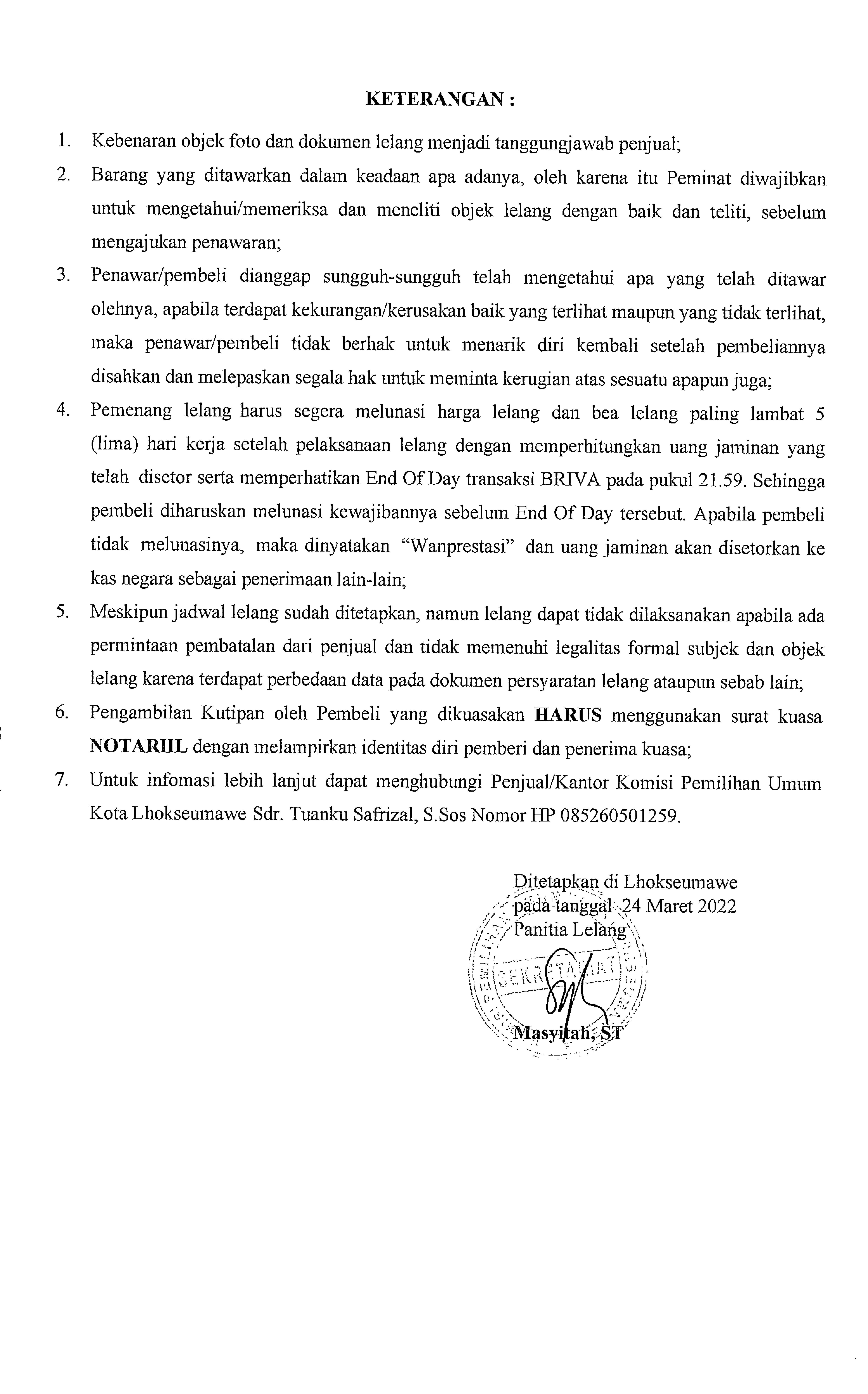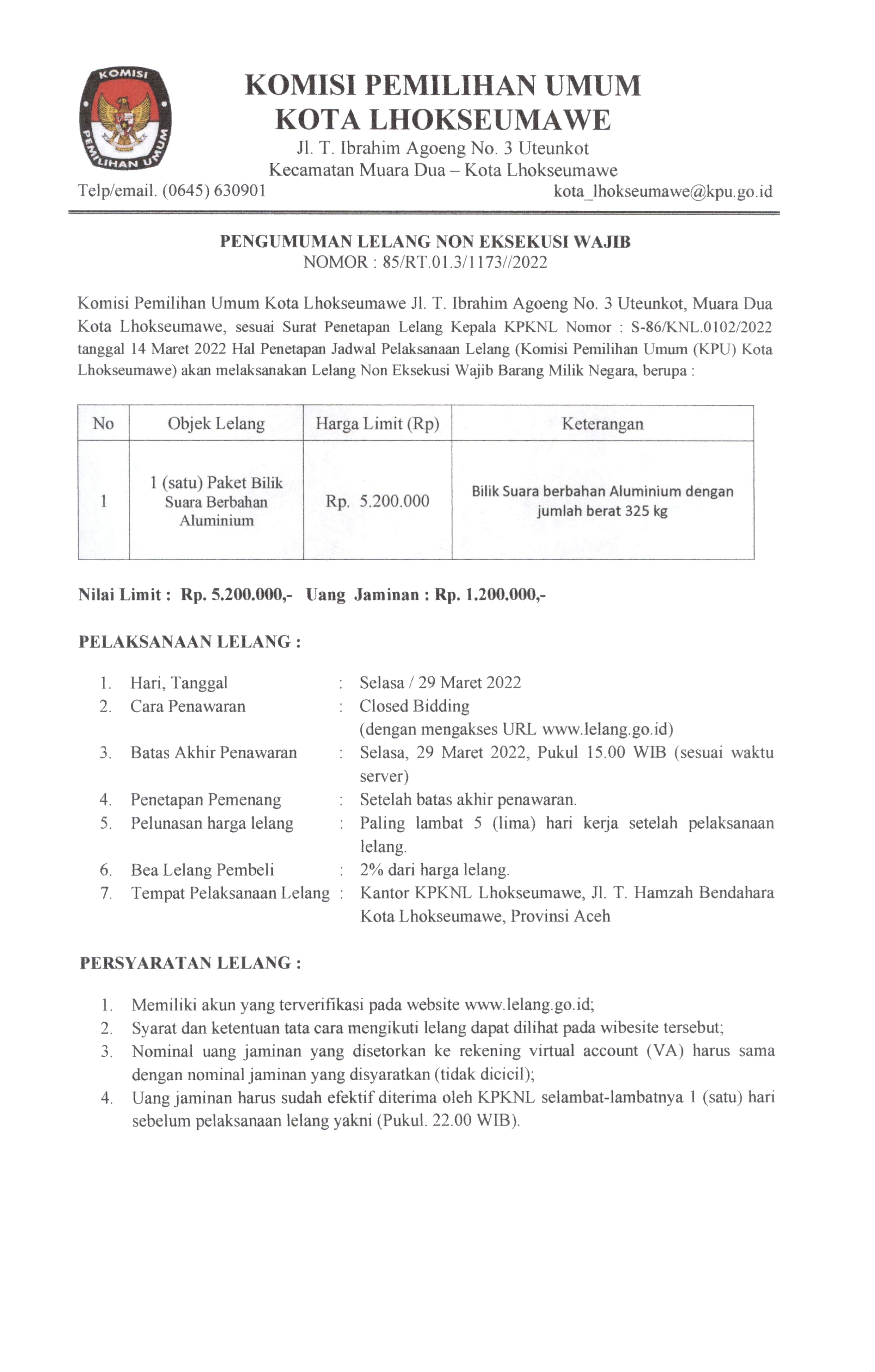PENGUMUMAN LELANG NON EKSEKUSI WAJIB Kamis, 24 Maret 2022 00:00 97 Download Dokumen Lelang Bagikan: Telah dilihat 97 kali
