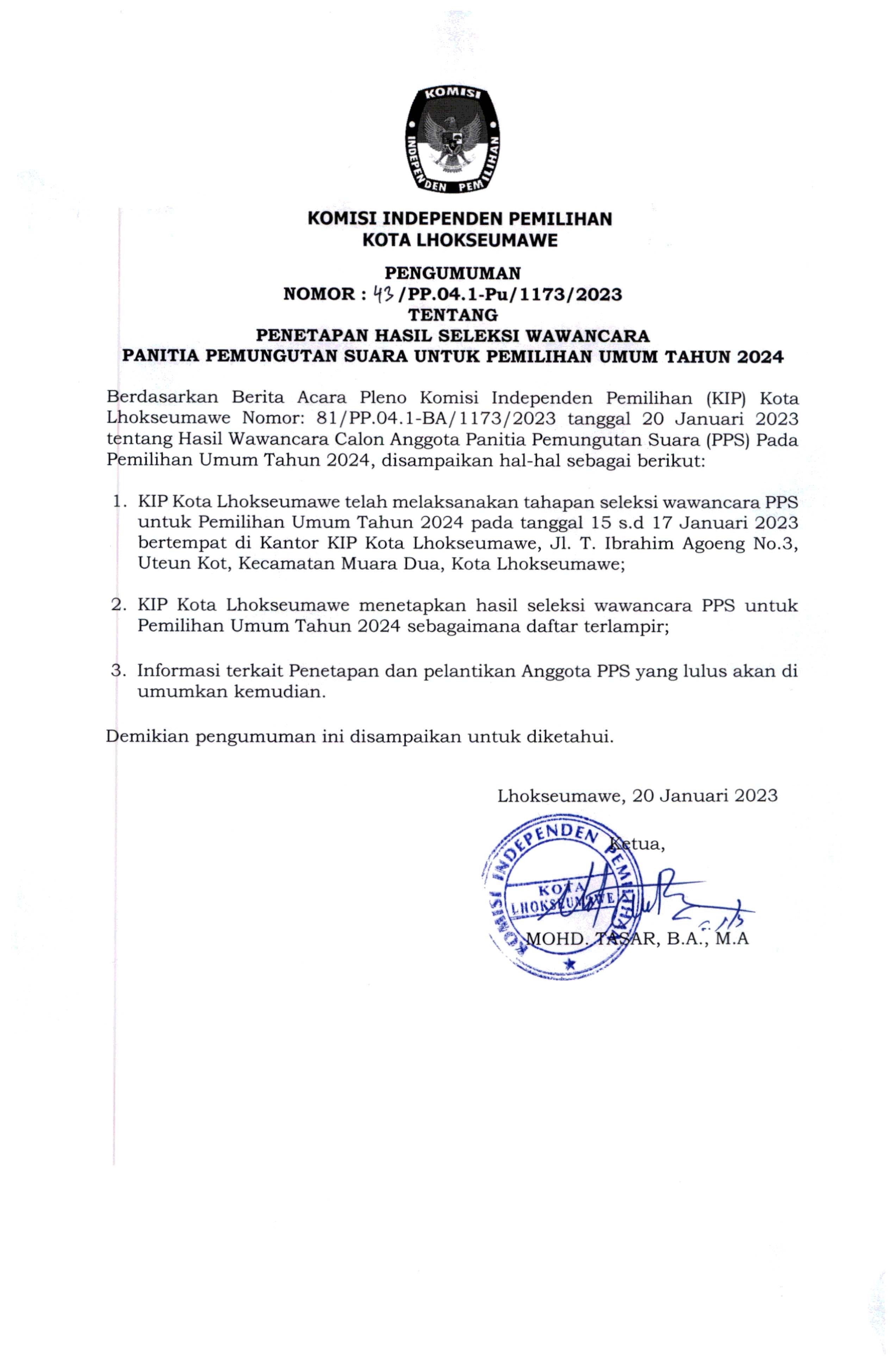 Pengumuman Penetapan Hasil Seleksi Wawancara Panitia Pemungutan Suara (PPS) Pada Pemilihan Umum Tahun 2024 Komisi Independen Kota Lhokseumawe dapat di unduh di tautan berikut ini Download disini