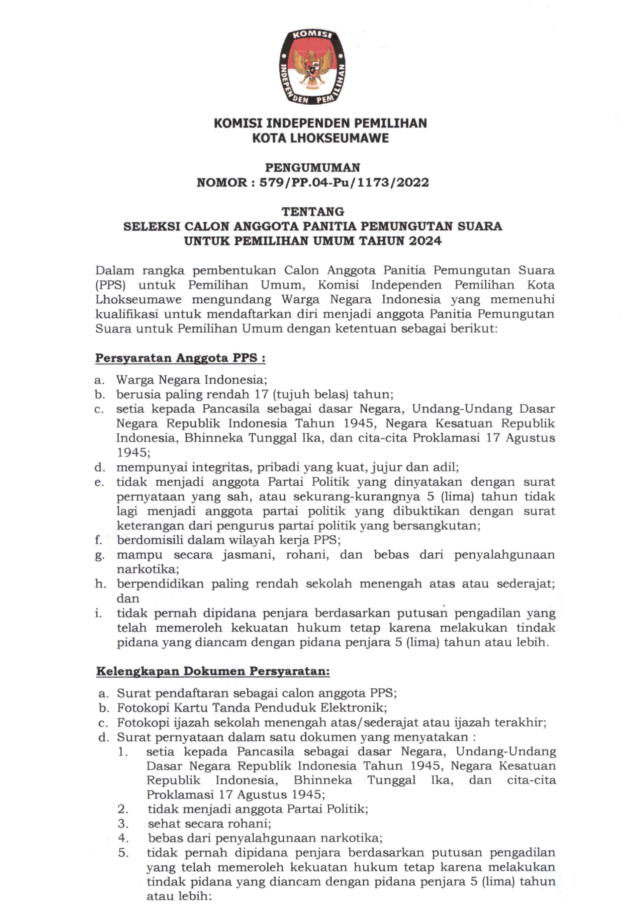 PENGUMUMAN SELEKSI CALON ANGGOTA PPS UNTUK PEMILU TAHUN 2024