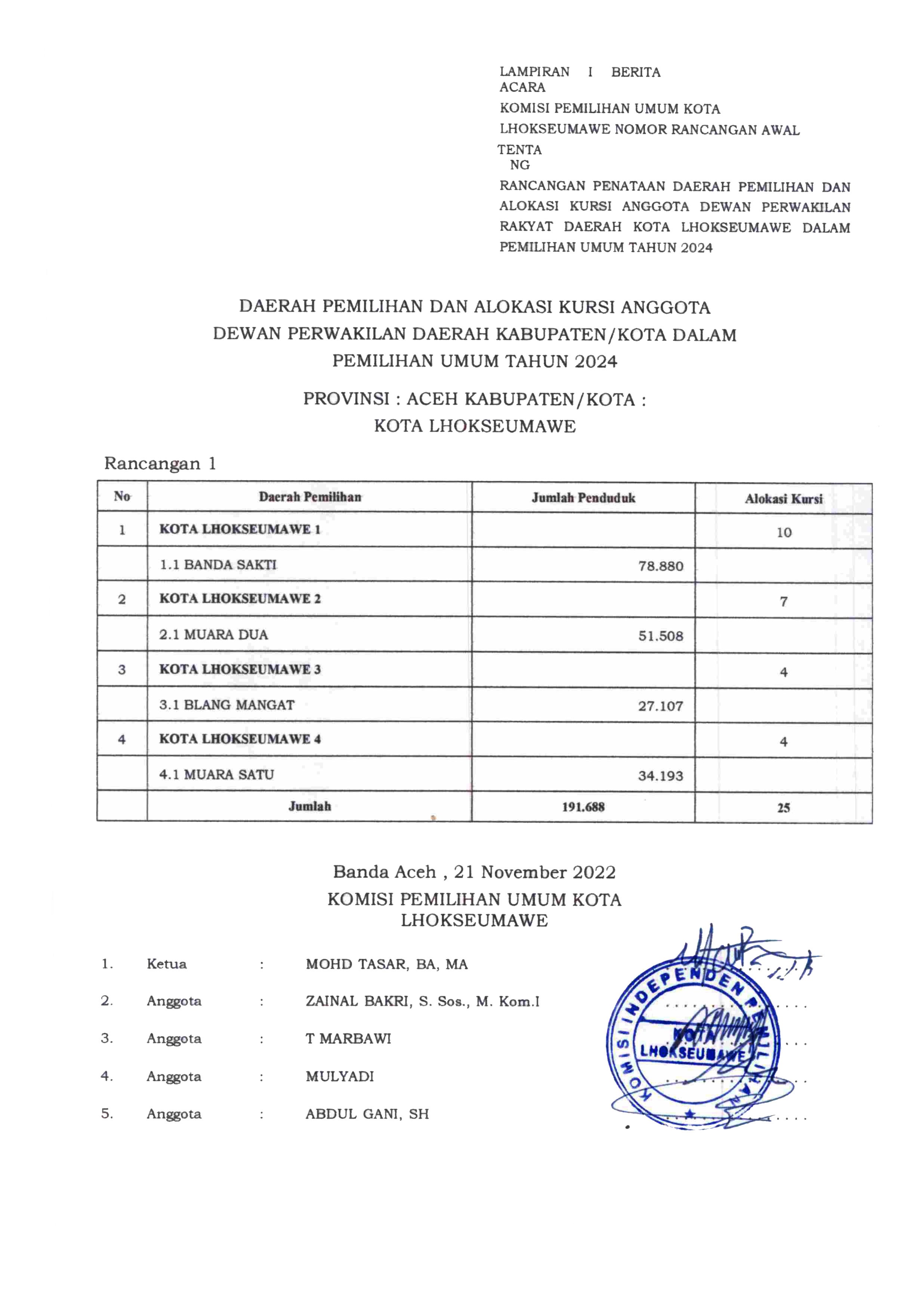 Berita Acara KIP Kota Lhokseumawe Nomor: 75/PL.01.1-BA/1173/2022 klik Download