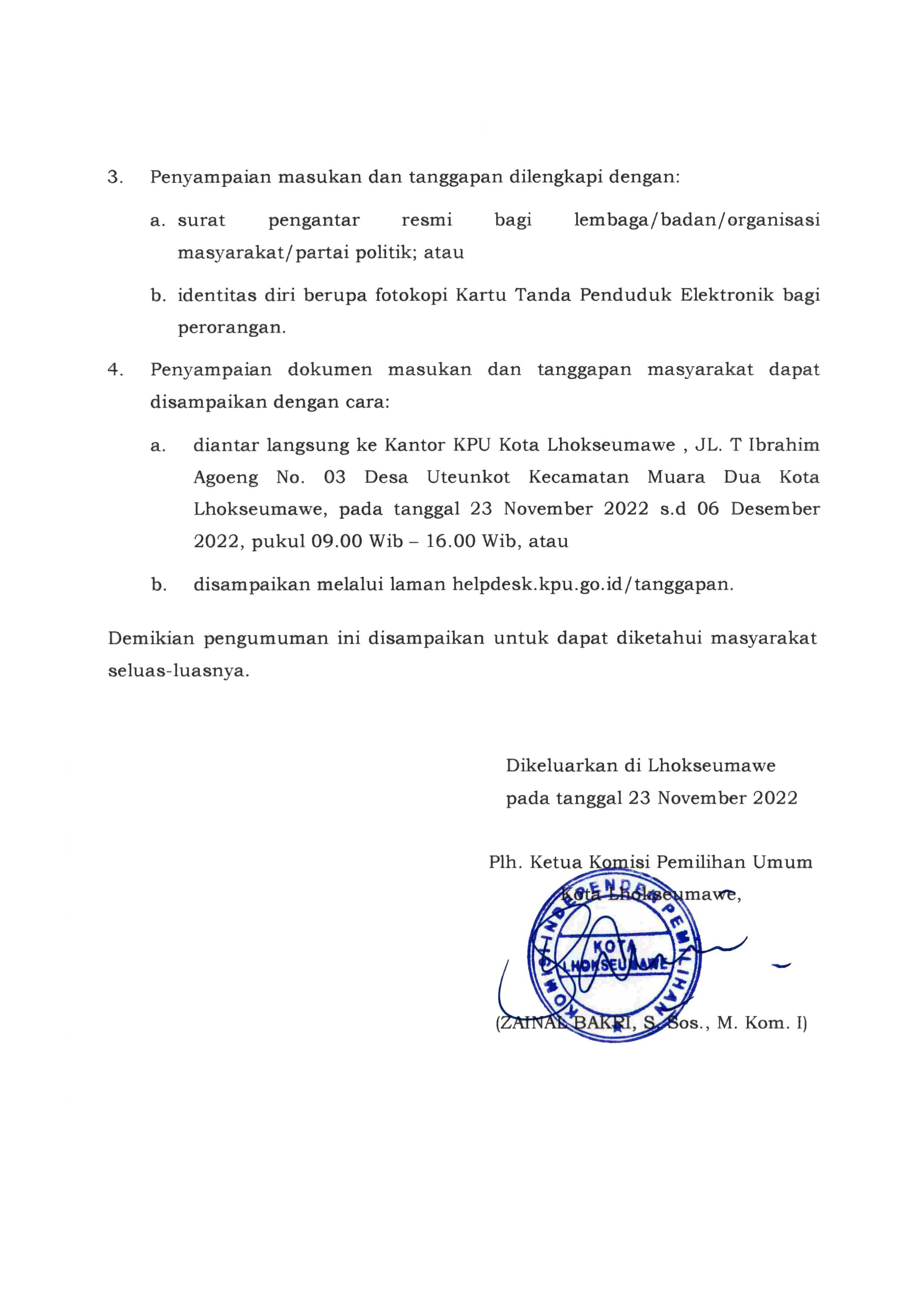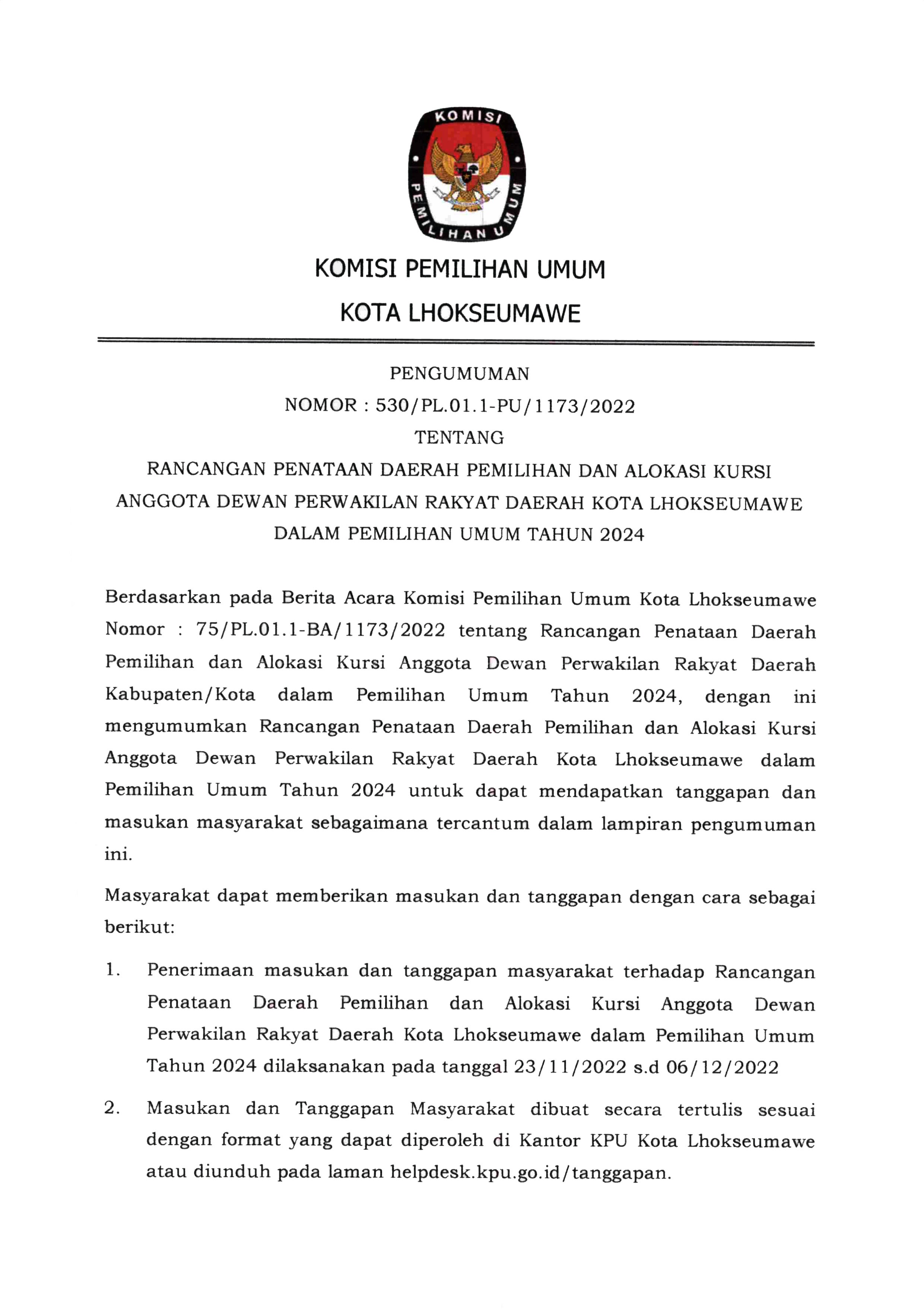 Pengumuman Tentang Rancangan Penataan Dapil dan Alokasi Kursi Pada Pemilu 2024 di Kota Lhokseumawe