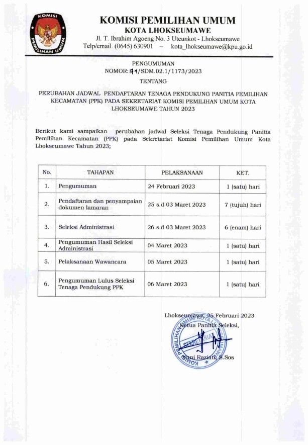 Perubahan Jadwal Pendaftaran Tenaga Pendukung PPK pada Sekretariat KPU Kota Lhokseumawe Tahun 2023