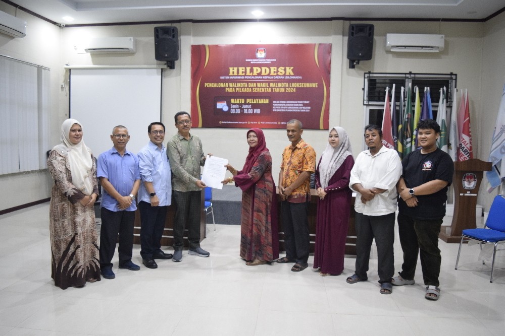 Komisi Independen Pemilihan (KIP) Kota Lhokseumawe menerima penyerahan Dokumen Syarat Dukungan Pasangan Calon Perseorangan H. Azhari , ST., M.S.M dan Hj. Ermiati Hamidah, S.Sos dan rombongan dikantor KIP Kota Lhokseumawe, Minggu, (12/5/2024) pukul 23.45 WIB. Rombongan diterima oleh Komisioner KIP Kota Lhokseumawe Divisi Teknis Penyelenggara Pemilu, T. Marbawi, Kadiv Hukum dan Pengawasan Internal, Indrawan Eka Putra, dan Kadiv Perencanaan Data dan Informasi, Zainal Bakri didampingi Sekretaris KIP Kota Lhokseumawe, Yuni Raziati dan jajaran staf sekretariat. Dokumen Syarat Dukungan Pasangan Perseorangan H. Azhari dan Hj. Ermiati Hamidah yang diserahkan sebanyak 6.003 dengan sebaran 4 Kecamatan, dinyatakan telah memenuhi syarat minimal yang ditetapkan oleh KPU, yaitu 3 % dari jumlah Daftar Penduduk Kota Lhokseumawe. Anggota KIP Kota Lhokseumawe, T. Marbawi menyampaikan apresiasinya kepada H. Azhari dan Hj. Ermiati Hamidah atas keseriusannya dalam mengikuti Pilkada 2024. Ia juga menghimbau kepada seluruh Bacalon untuk tetap menjaga kondusifitas dan mengikuti aturan yang berlaku. “Kami berharap Pilkada 2024 dapat berjalan dengan lancar, aman, dan damai. Kepada seluruh Bacalon, kami menghimbau untuk tetap menjaga kondusifitas dan mengikuti aturan yang berlaku,” ujar T. Marbawi.