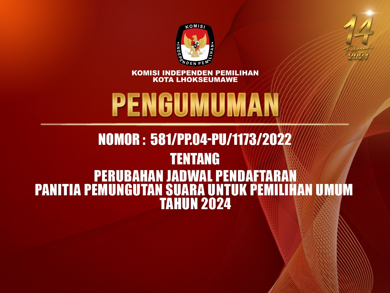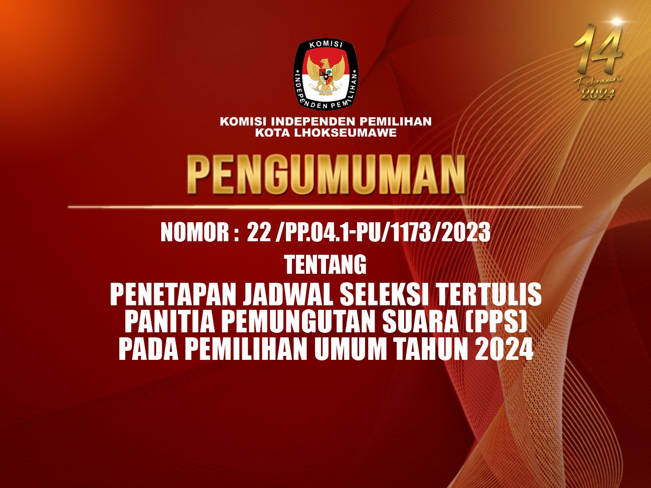 Pengumuman Jadwal Seleksi Tertulis Panitia Pemungutan Suara (PPS) Pada Pemilihan Umum Tahun 2024 Komisi Independen Kota Lhokseumawe dapat di unduh di tautan berikut ini Download disini