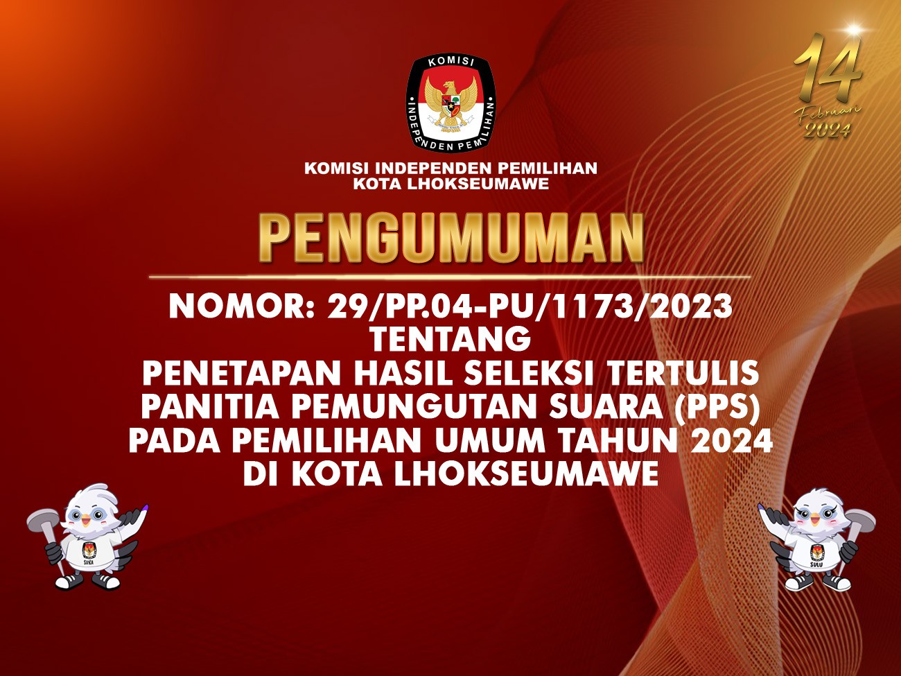 Pengumuman Penetapan Hasil Seleksi Tertulis Panitia Pemungutan Suara (PPS) Pada Pemilihan Umum Tahun 2024 Komisi Independen Kota Lhokseumawe dapat di unduh di tautan berikut ini Download disini