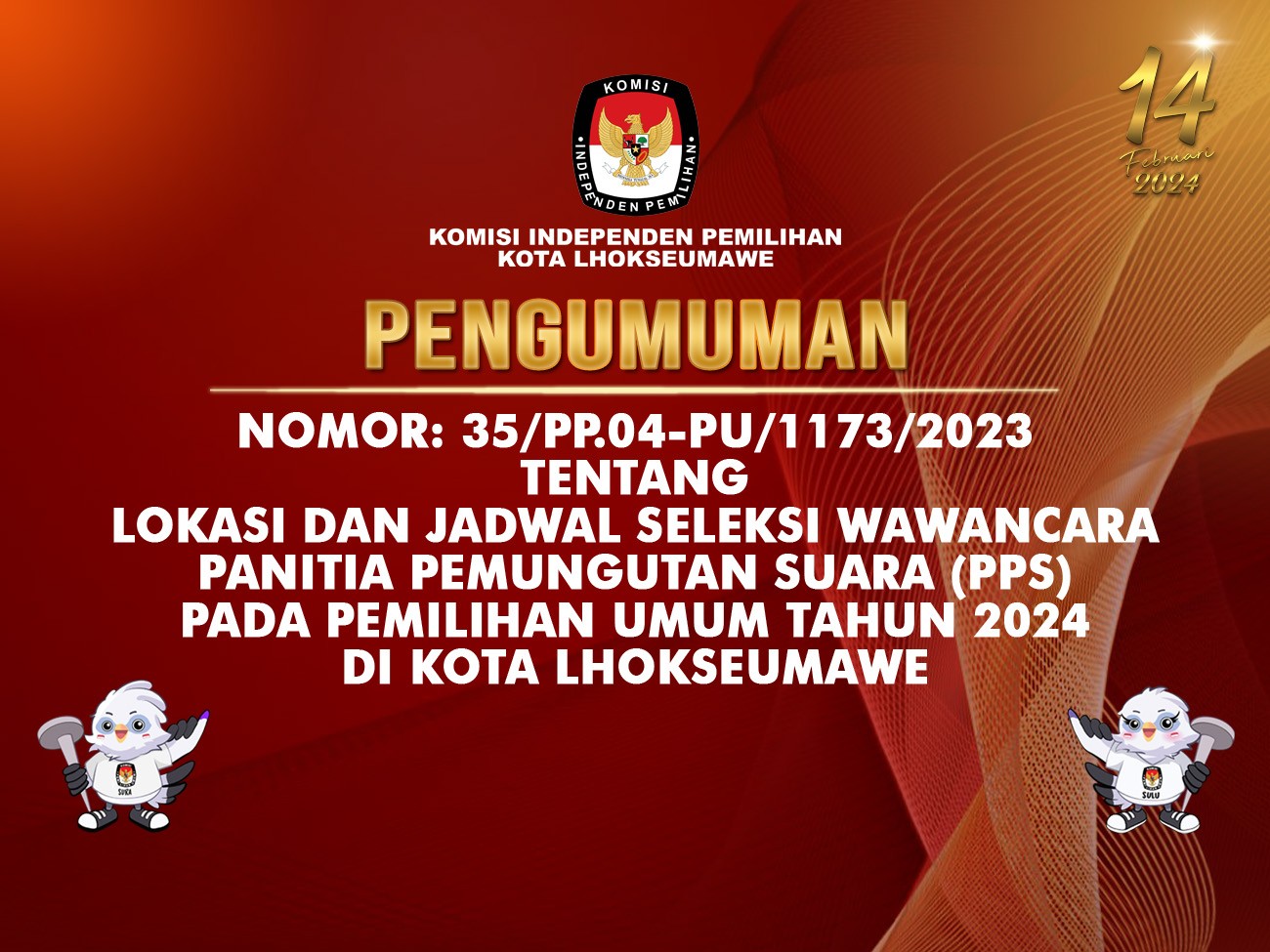 Pengumuman Jadwal dan Lokasi Seleksi Wawancara Panitia Pemungutan Suara (PPS) Pada Pemilihan Umum Tahun 2024 Komisi Independen Kota Lhokseumawe dapat di unduh di tautan berikut ini Download disini