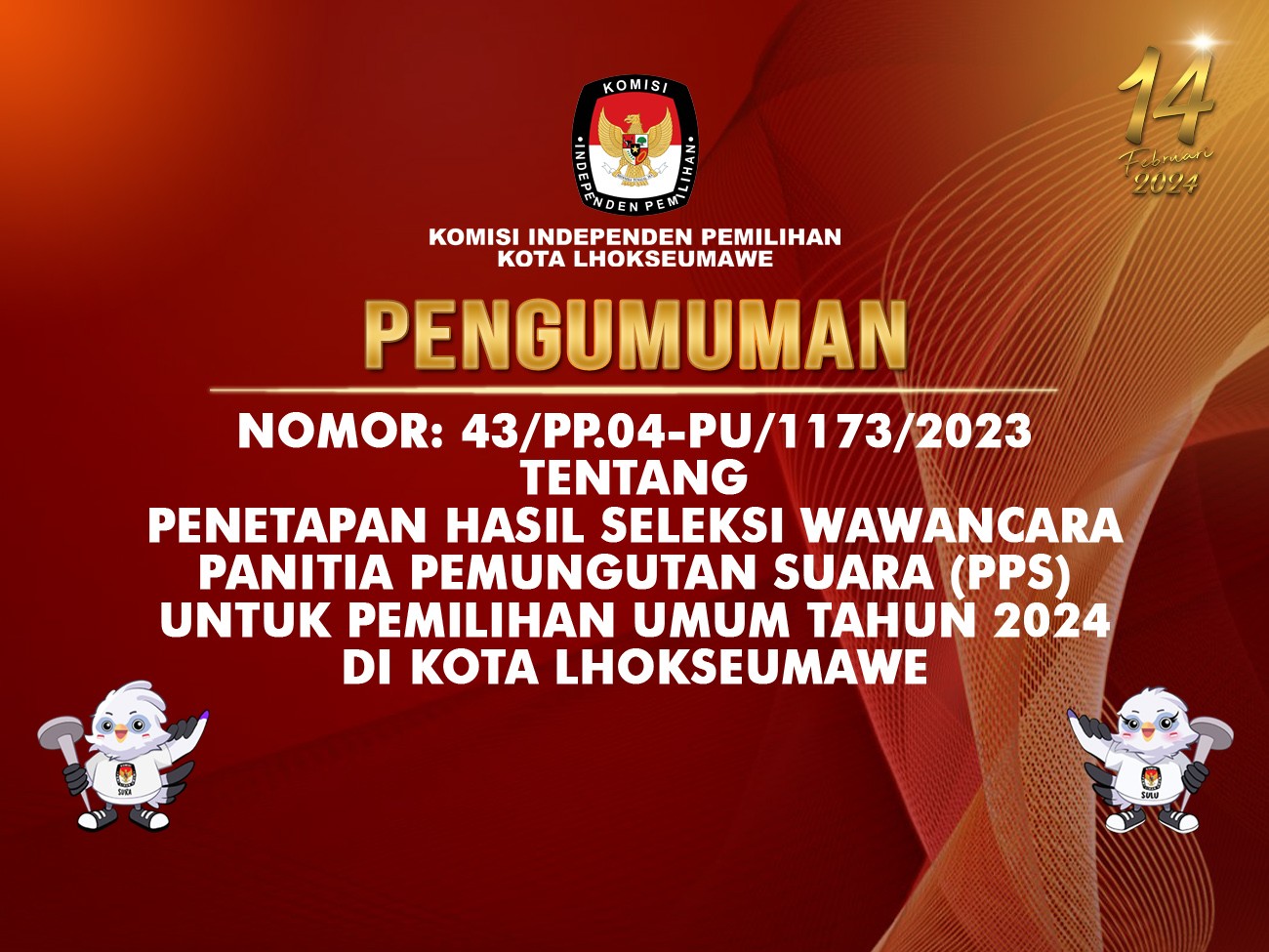 Pengumuman Penetapan Hasil Seleksi Wawancara Panitia Pemungutan Suara (PPS) Pada Pemilihan Umum Tahun 2024 Komisi Independen Kota Lhokseumawe dapat di unduh di tautan berikut ini Download disini